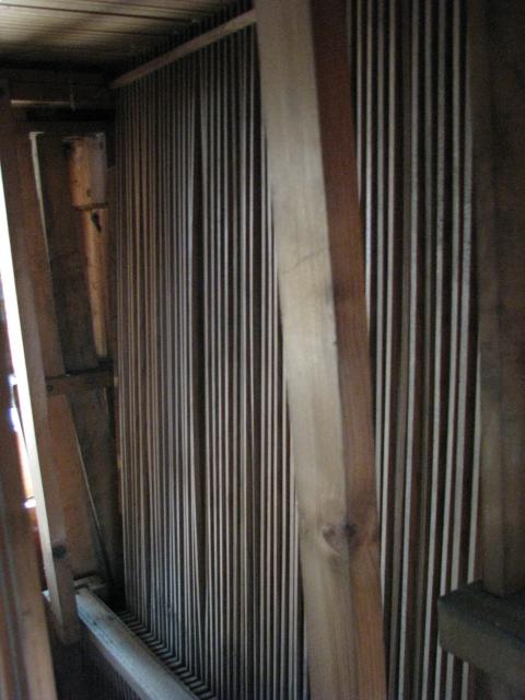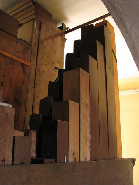 Pohled skrz prospekt - za dřevěnými píšťalami jsou další cínové píšťaly (patrně oktáva 2')