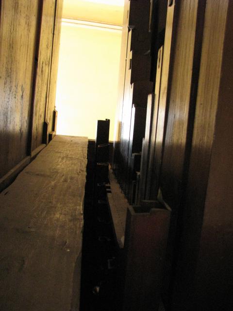 Pohled do skříně - vpravo jsou píšťaly pedálového stroje (Violonbass), vespod pedálové abstrakty