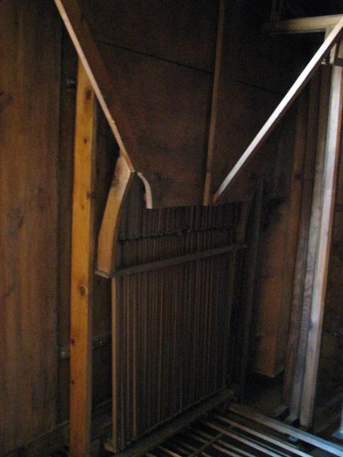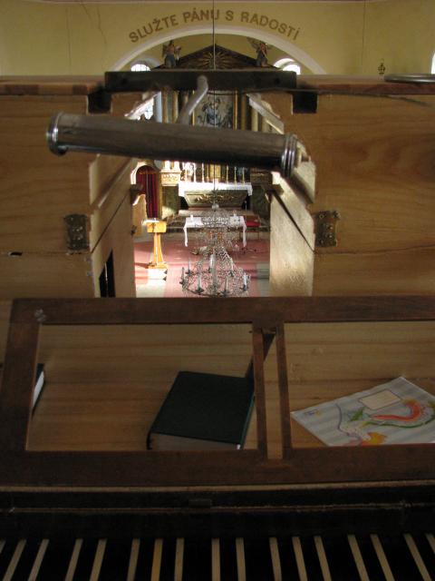 Pohled skrz prospekt hlavního stroje - patrné dřevěné píšťaly (flétna 8')