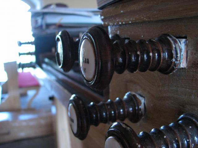 Manubria rejstříků pozitivu (růžová) a pedálu (modrá)
