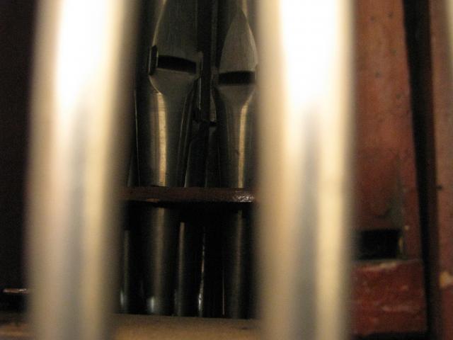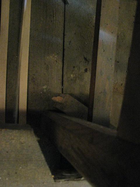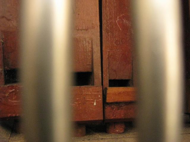 Pohled na podlahu u pedálového stroje - na podlaze leží červotočivá páka odlomená od hřídele rejstříkové traktury violonbassu