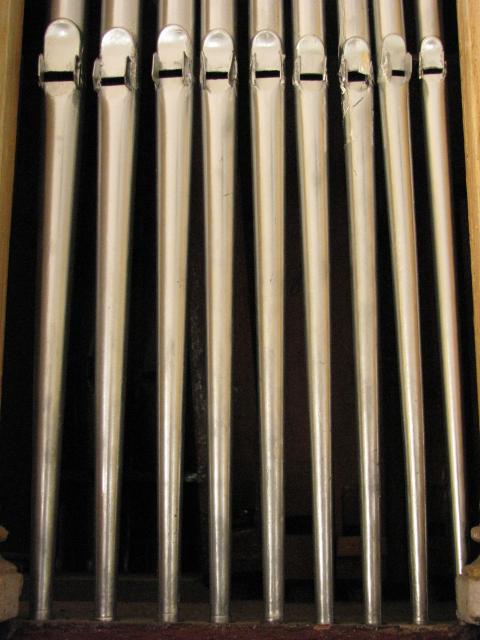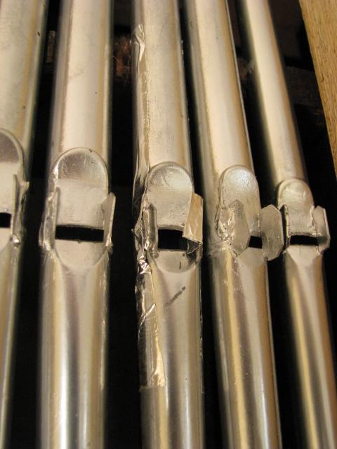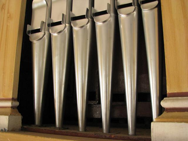 Detail prospektu - nastříbřené zinkové píšťaly. Třetí píšťala zprava je spravovaná pomocí hliníkové lepící pásky (d2 principálu 4')