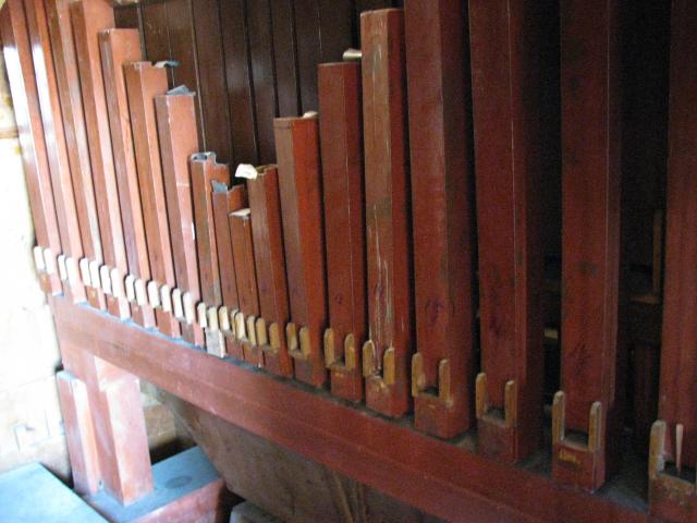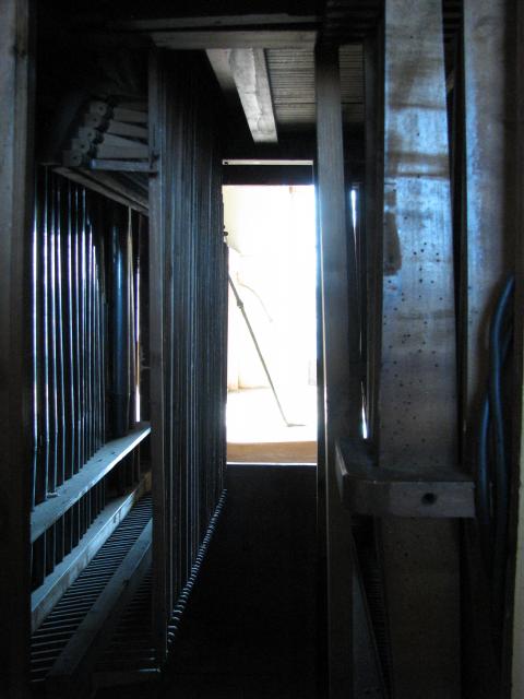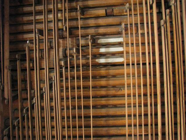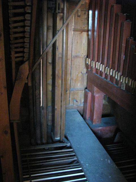 Pohled z boku do hracího stolu. Zleva jsou patrné píšťaly pozitivu, abstrakty od horní hlávesnice, tlačné tyče spodní klávesnice, páky rejstříkové traktury pozitivu a úplně vpravo kabely od spínače motoru ventilátoru
