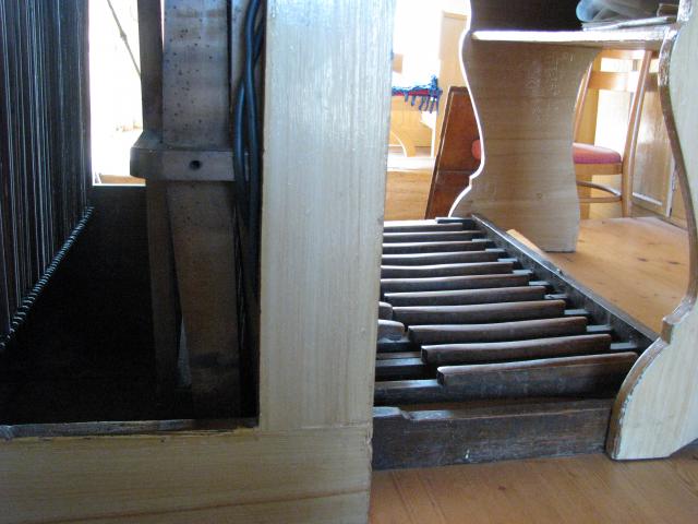 Otevřený hrací stůl - za tlačnými tyčkami spodní klávesnice sotva patrné abstrakty od horní klávesnice a za nimi píšťaly pozitivu; vespod část pedálnice