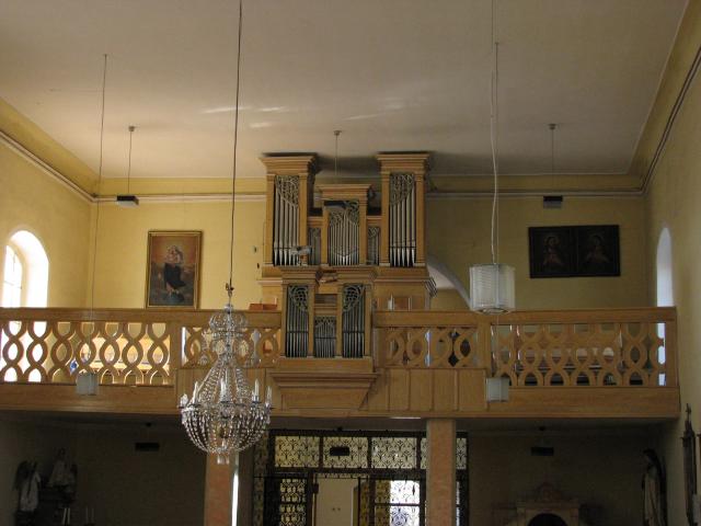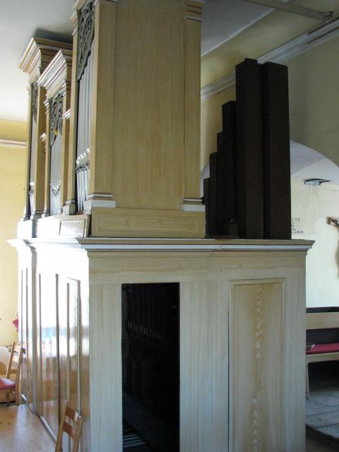 Zadní pohled na varhany - patrné dřevěné píšťaly pedálového stroje