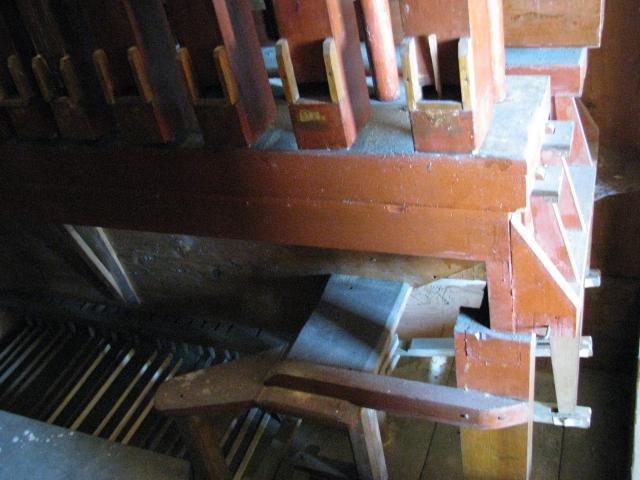 Vzdušnice pedálového stroje z boku - patrná část rejstříkové traktury - táhla a páky vedoucí k zásuvkám vzdušnice. Píšťalové řady zleva: violonbass, oktávabass a subbass