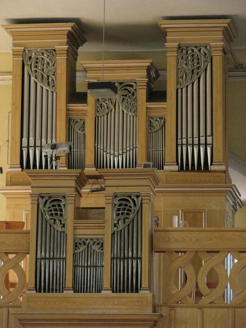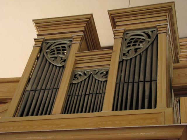 Zinkové píšťaly prospektu a sotva patrné dřevěné píšťaly za nimi