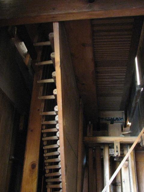 Pohled z boku na hřídelový rozvaděč hlavního stroje, nahoře patrná vzdušnice a v pozadí část rejstříkové traktury