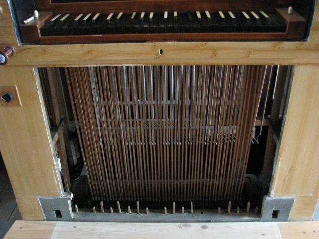 Pohled do hracího stolu - nahoře jsou vidět klávesy spodní klávesnice (ze spoda), od nichž jdou tlačné tyče ke zbytku traktury vedoucí pod pedálnicí do hlavního stroje