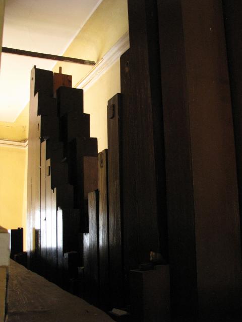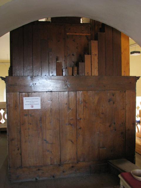 Zadní pohled na varhany - patrné dřevěné píšťaly pedálového stroje