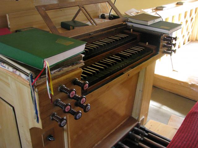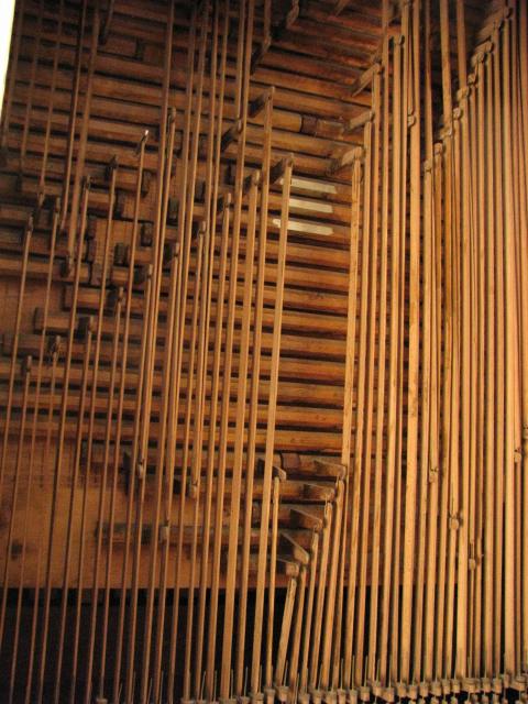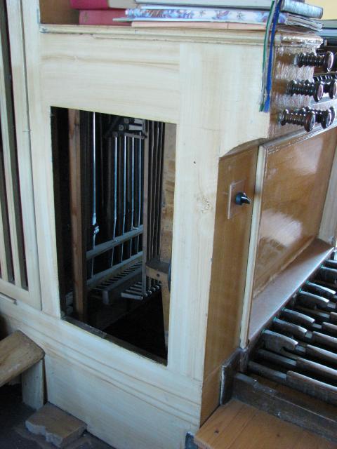 Pohled z boku do hracího stolu. Zleva jsou patrné píšťaly pozitivu, abstrakty od horní hlávesnice, tlačné tyče spodní klávesnice, páky rejstříkové traktury pozitivu a úplně vpravo kabely od spínače motoru ventilátoru