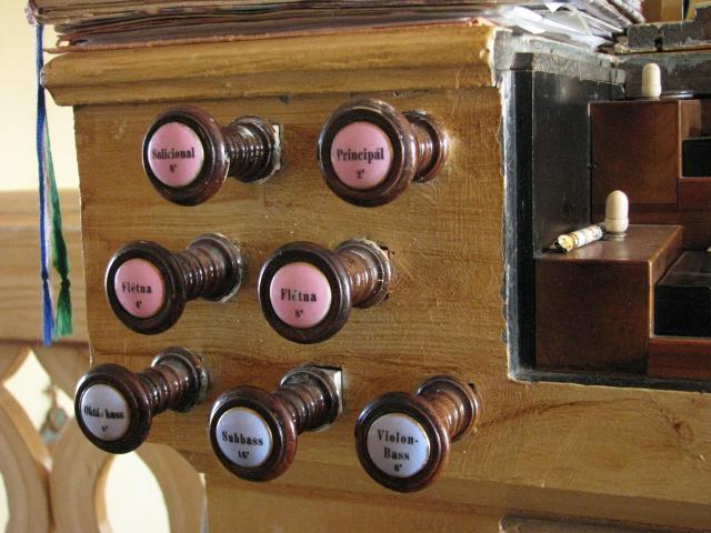 Manubria rejstříků pozitivu (růžová) a pedálu (modrá)