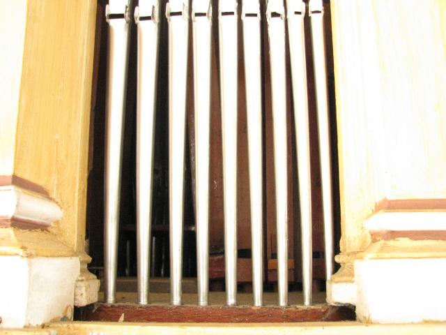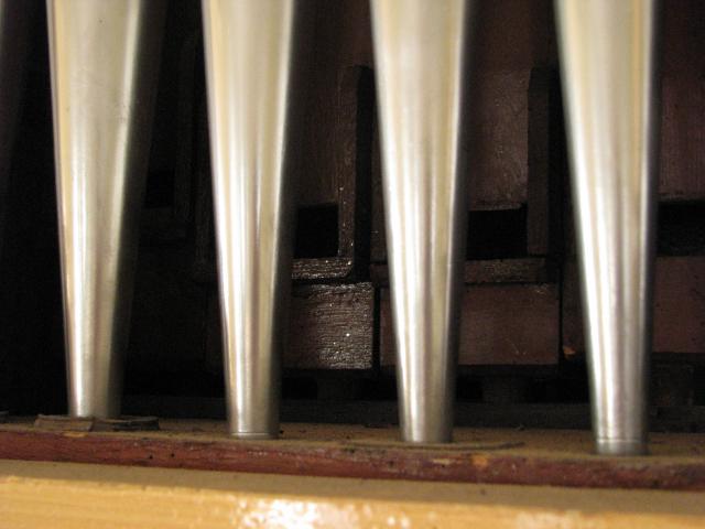 Detail prospektu - nastříbřené zinkové píšťaly. Třetí píšťala zprava je spravovaná pomocí hliníkové lepící pásky (d2 principálu 4')