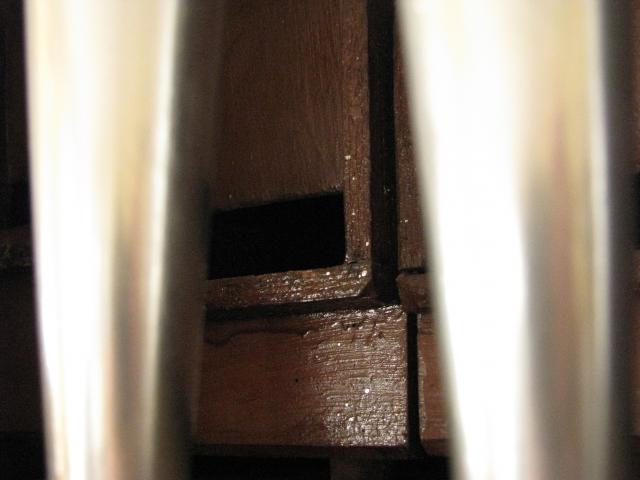 Pohled skrz prospekt - za dřevěnými píšťalami jsou další cínové píšťaly (patrně oktáva 2')