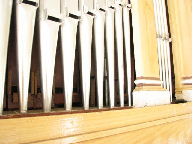 Zinkové píšťaly prospektu a sotva patrné dřevěné píšťaly za nimi