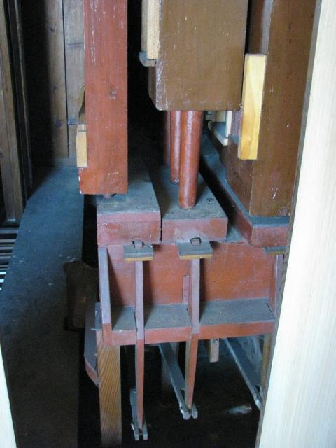 Vzdušnice pedálového stroje z boku - patrná část rejstříkové traktury - táhla a páky vedoucí k zásuvkám vzdušnice. Píšťalové řady zleva: violonbass, oktávabass a subbass