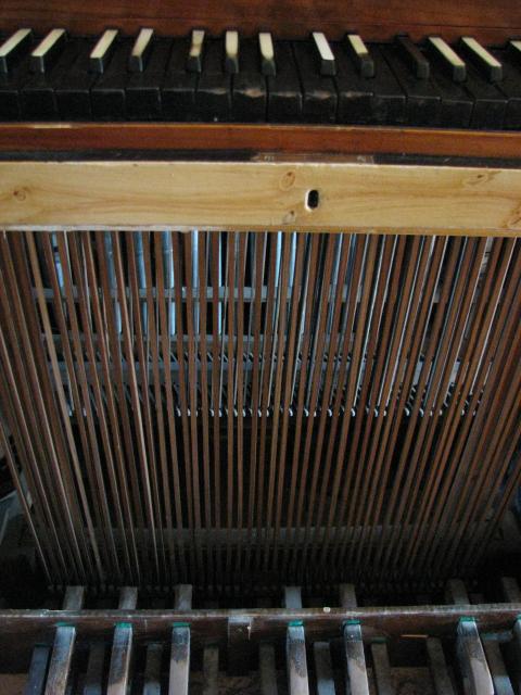 Pohled do hracího stolu - nahoře jsou vidět klávesy spodní klávesnice (ze spoda), od nichž jdou tlačné tyče ke zbytku traktury vedoucí pod pedálnicí do hlavního stroje